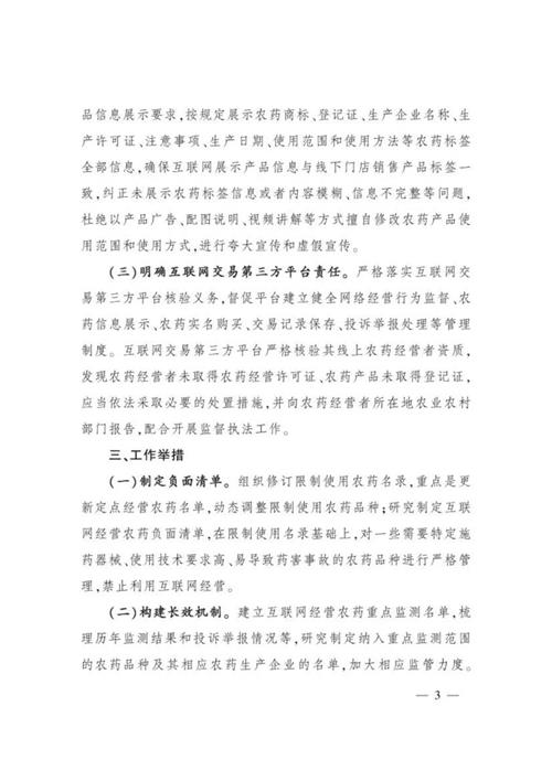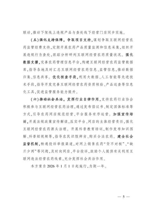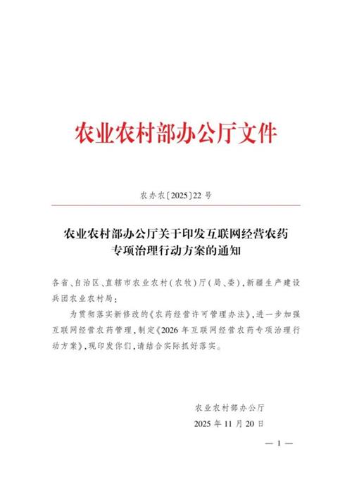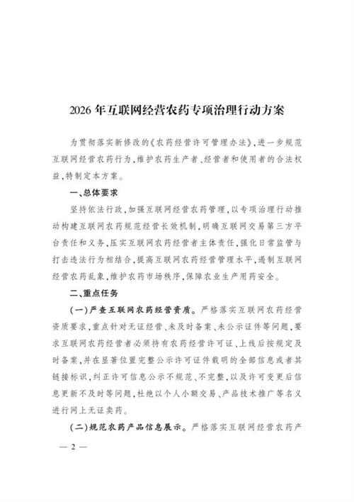 为贯彻落实新修改的《农药经营许可管理办法》,进一步加强互联网经营农药管理,制定《2026年互联网经营农药专项治理行动方案》,现印发你们,请结合实际抓好落实。